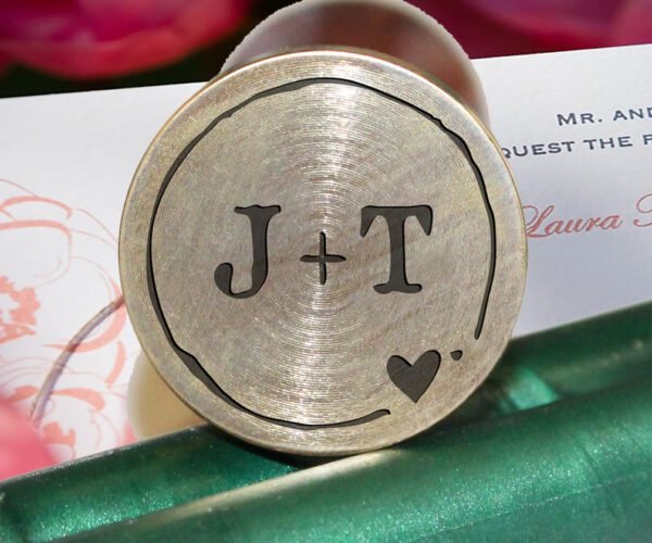 Two letter wedding wax seal stamp with cute heart border. Letters positioned side by side between a small plus sign and surrounded by a cute heart border. Ready to go, perfect for weddings, just tell us your letters to be engraved.